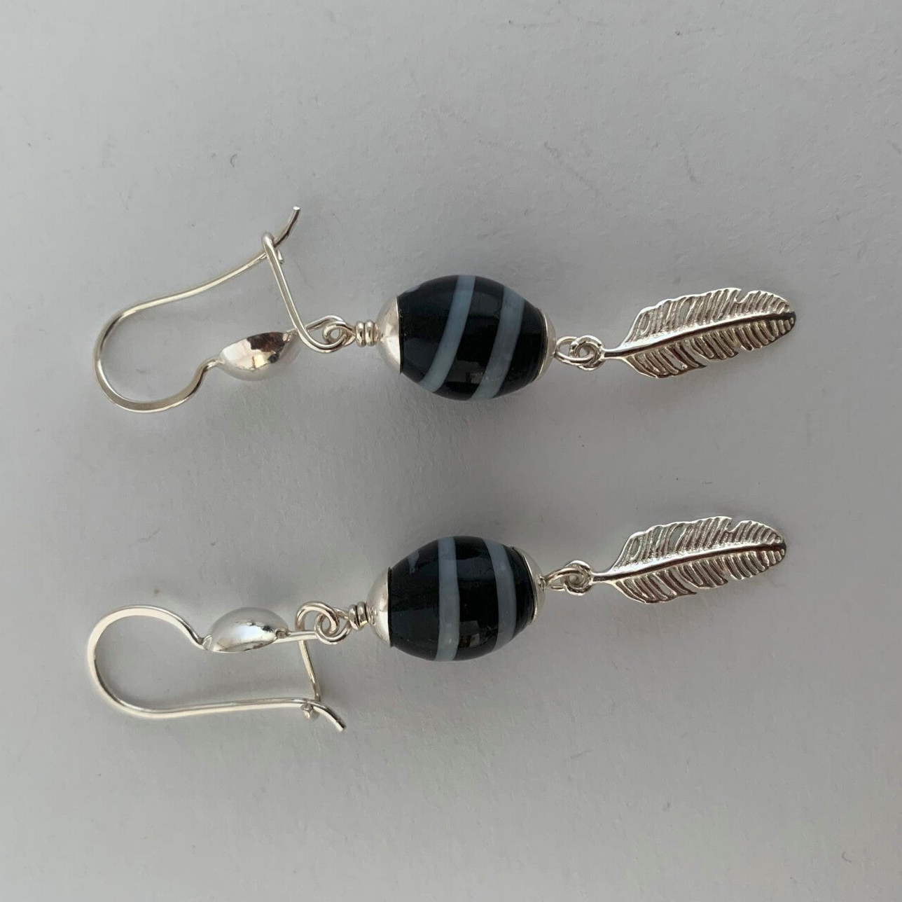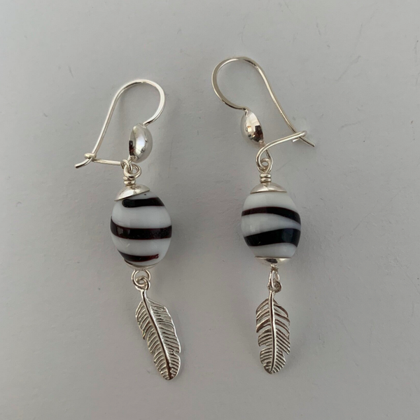 Zilveren oorbellen met kromanti kralen met veertje.