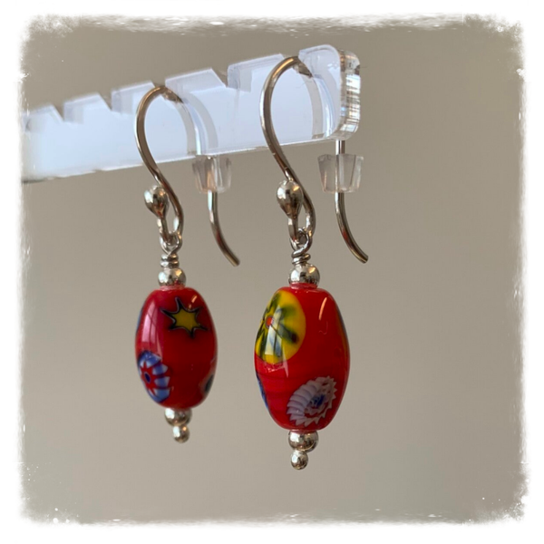 Deze rode kralen hebben alakondre motieven. Boven en onder deze kraal zit een zilver balletje