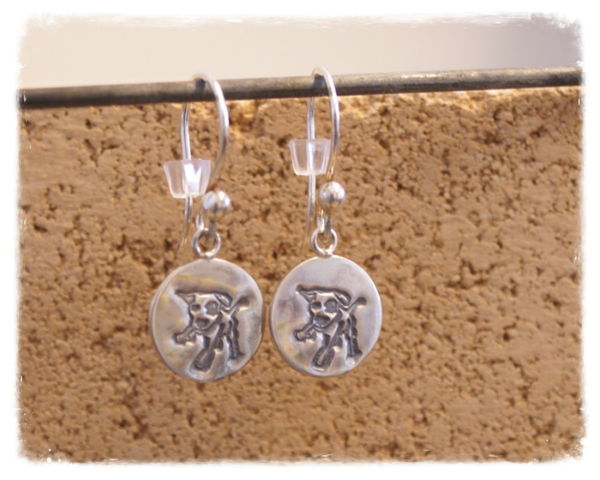 Deze zilveren oorhaken hebben een muntje met puppy hondje als afbeelding.