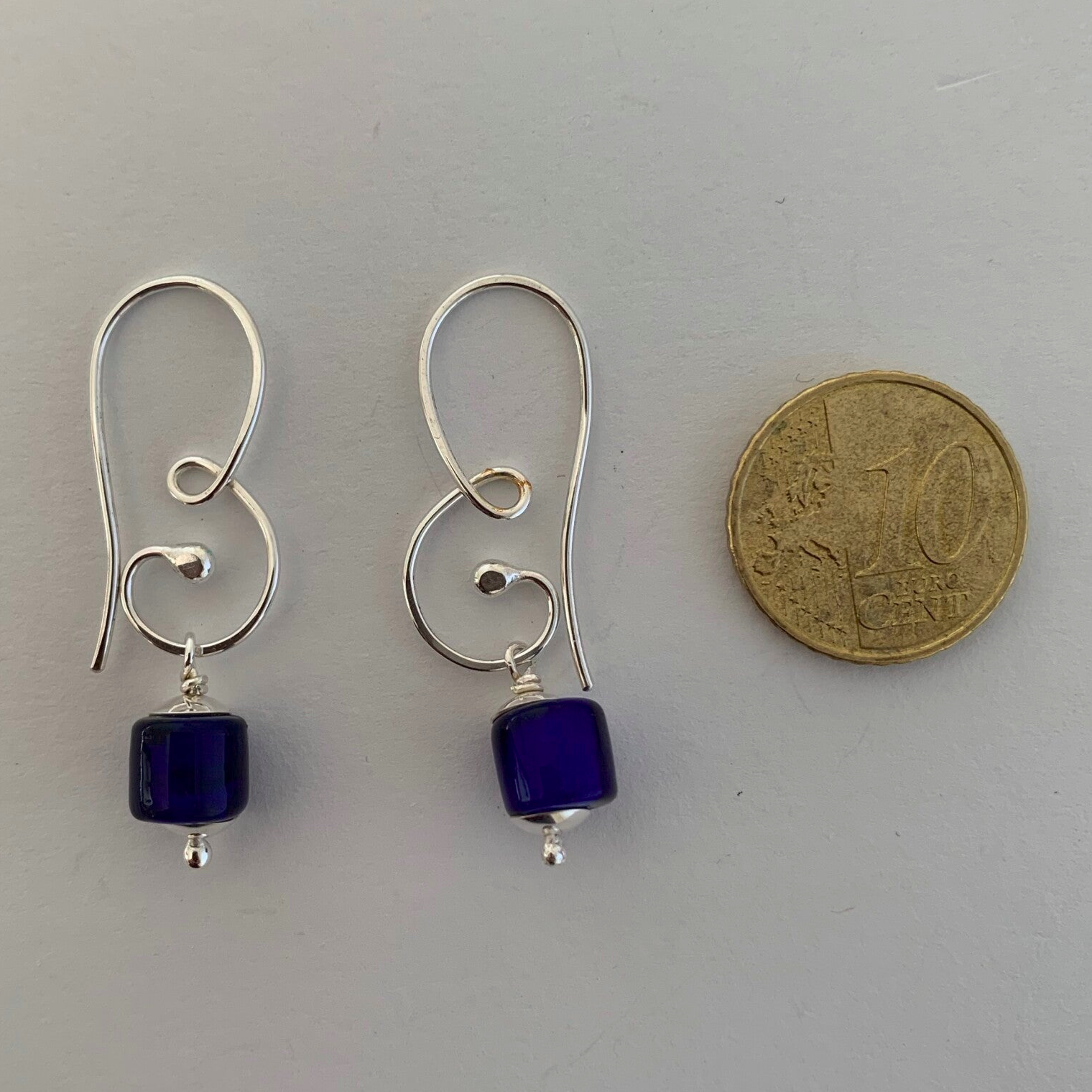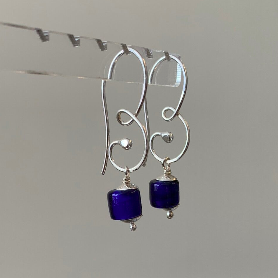 Moderne oorhaken in krul vorm. Klein of groot model.Een linker en een rechter oorbel. Met blauwe ingi boka`s