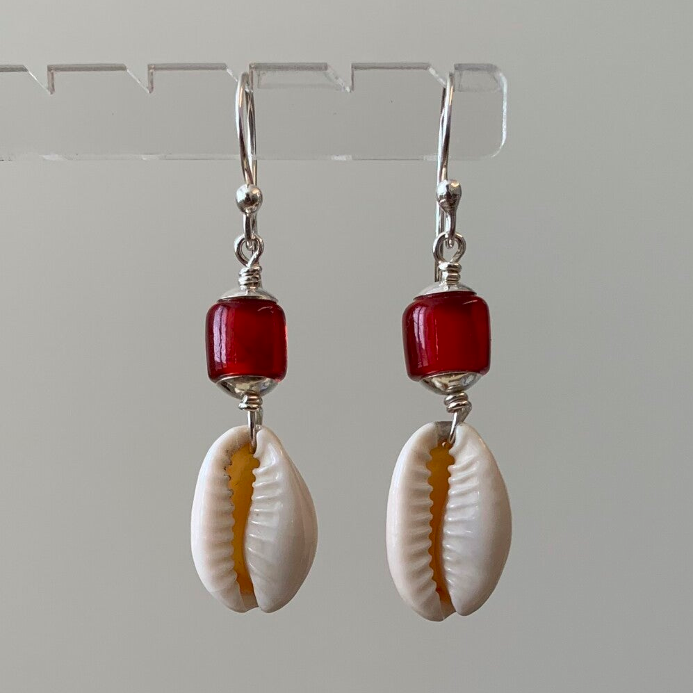 Zilveren oorbellen met rode of blauwe ingi boka en kauri schelpen.